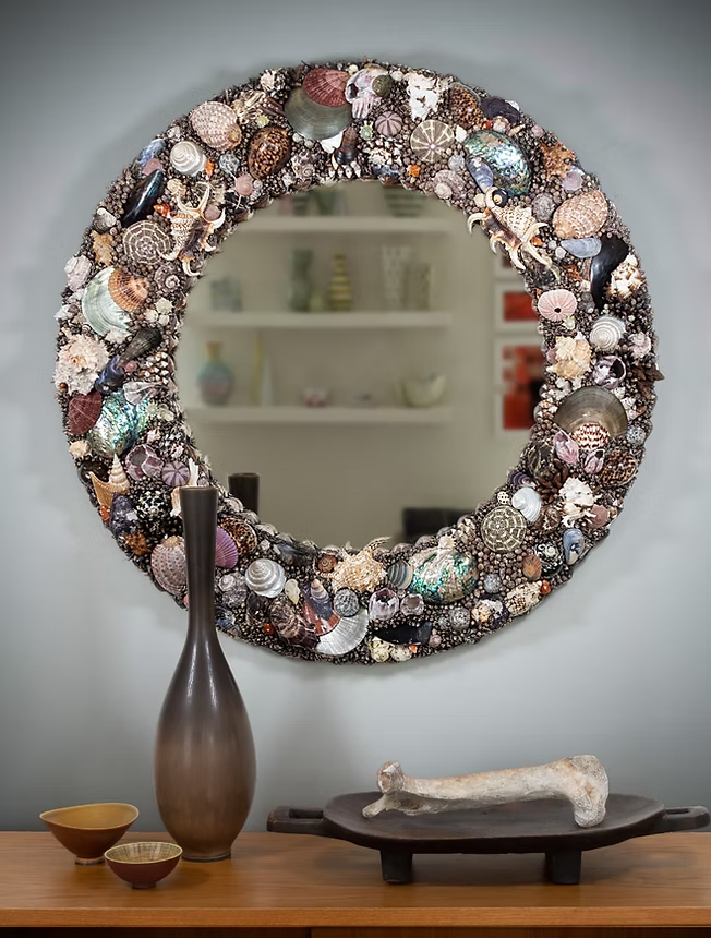 We love to make shell art that will fit your requirements precisely. Maybe you like a work that we’ve done but you want to alter the color nuance or size to make it fit your wall perfectly. You decide shape and measures: a smaller face mirror, a full body mirror, round, oval, equilateral or rectangular, organic etc.
