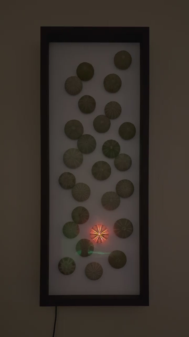 LUMINOUS No. 2 – No. 2 in our Luminous Sea Urchin wall decoration series. It brings a warm, shifting light and peaceful tranquility to your wall. During the day it’s an intricate graphic pattern and when evening comes it sends out waves of comforting light into your room. Bright or dim, slow pulse or quick, intense or calm, blue, white, red, orange, yellow – just as you command it. We uniquely customize the light flow for each piece but once it's on your wall there’s literally hundreds of different patterns and colors for you to operate with. Find one that suits your mood for the hour and change it whenever you want.