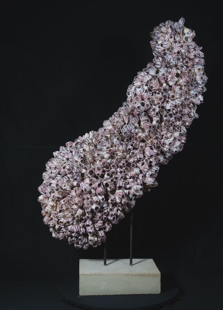MORNING GLORY – An impressive free-standing barnacle sculpture worthy of exposure in a central spot. It'll make a statement – we promise! The intense pink is an eye-catching, jaw-dropping feature. Back side is covered with Swedish oyster shells and black Lightning Dove shells. It's a beauty!