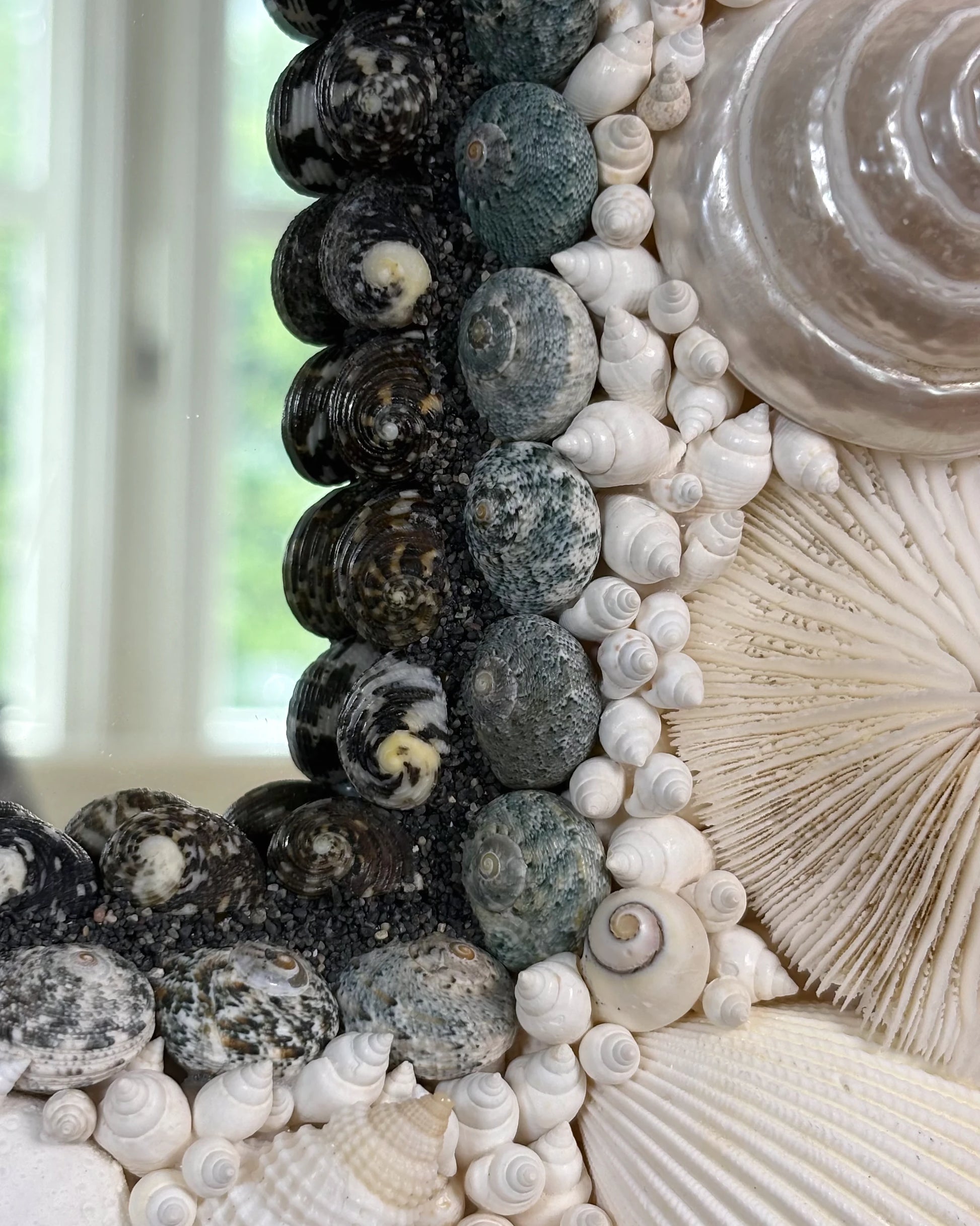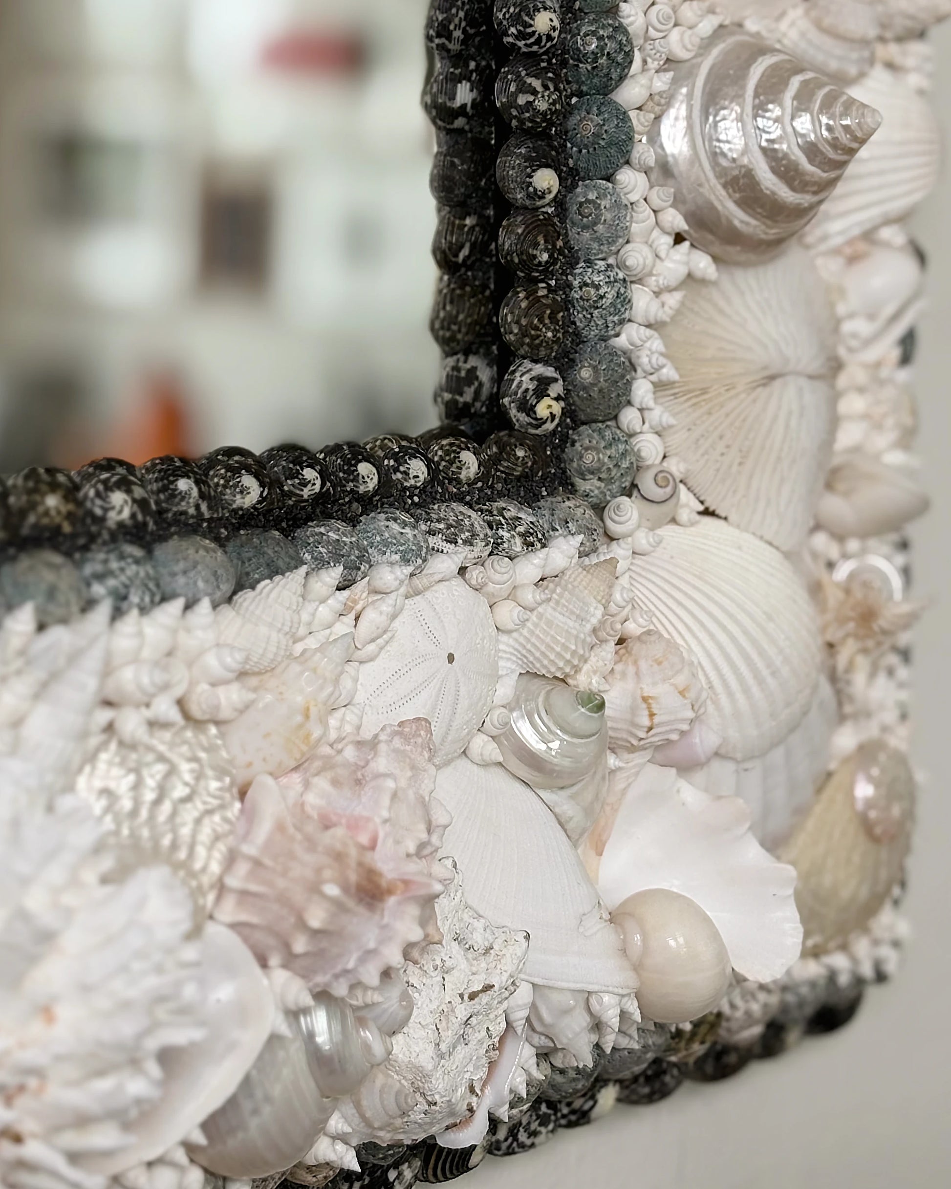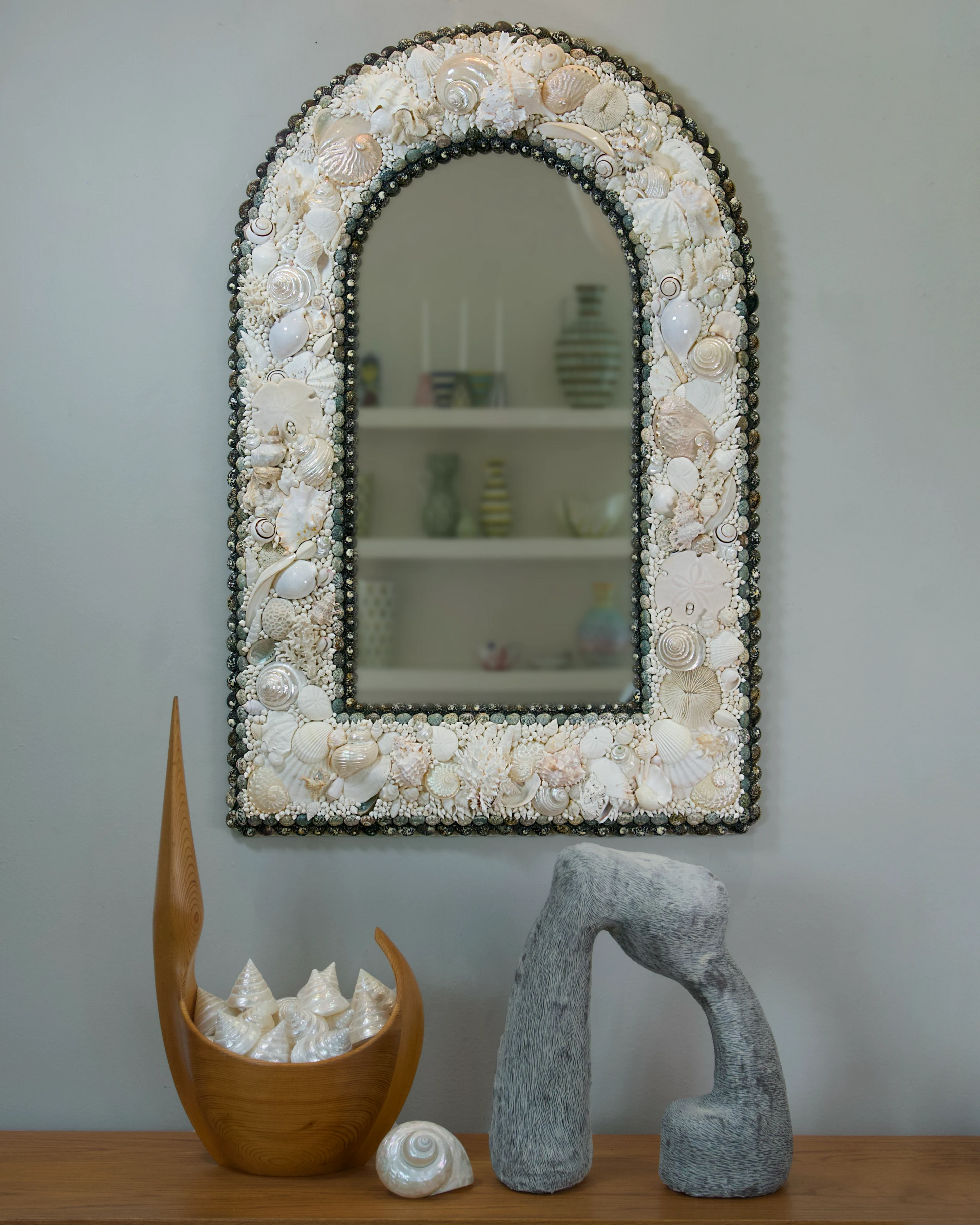 White Arc – On this mirror frame, hundreds of tiny white shells (put in place one by one) give prominence to the unique and careful touch of a Shellman piece – it’s all in the details! Hours and hours are invested in our search for excellence. Bigger and shiny shells highlight the topography and depth of this mid-size Shellman mirror. Is there a space for White Arc on your wall?